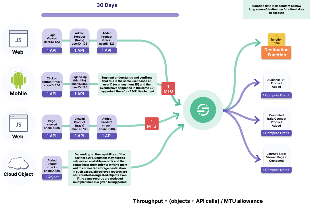 Object Cloud Sources retrieve records from integration partners on a scheduled basis. Segment processes these records before writing them out to connected Storage Destinations. Segment counts one object for each record retrieved from a Cloud Source. The number of objects ingested during a billing period has a direct impact on throughput, which is calculated as (objects ingested + API calls received) / MTU allowance.